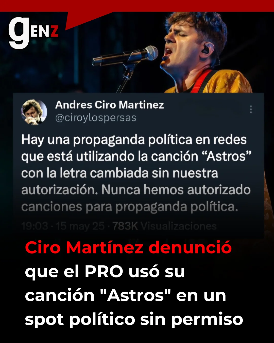 Andrés Ciro Martínez, reconocido músico argentino y líder de Ciro y los Persas, expresó su descontento con el PRO por el uso no autorizado de su canción «Astros» en un spot de campaña para la legisladora porteña Silvia Lospennato.