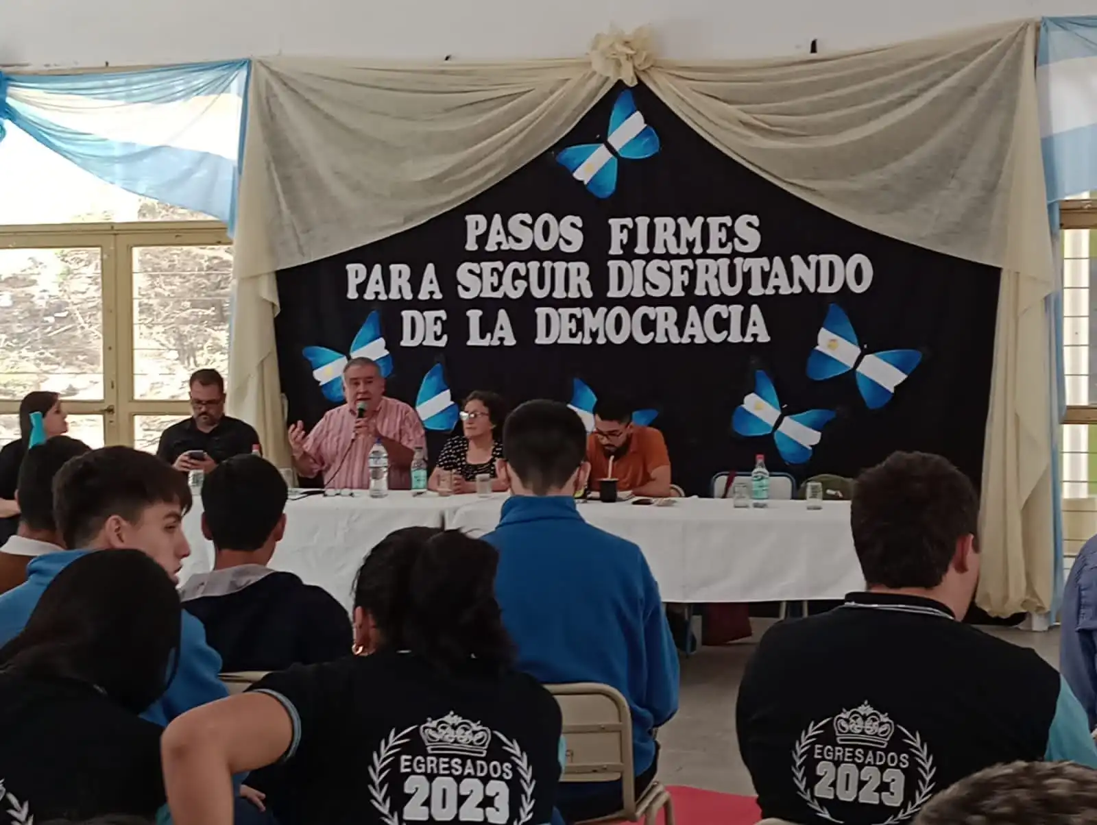 Bajo el lema «Pasos firmes para seguir disfrutando la democracia», se llevó a cabo una jornada educativa en la que el secretario de Derechos Humanos, Delfor Brizuela, la expresa política Azucena de La Fuente, el profesor Alejandro Gros Bruna y varios docentes se unieron a estudiantes para analizar el Terrorismo de Estado que marcó al país en 1976 y el papel de los organismos de Derechos Humanos desde 1983 hasta la actualidad.