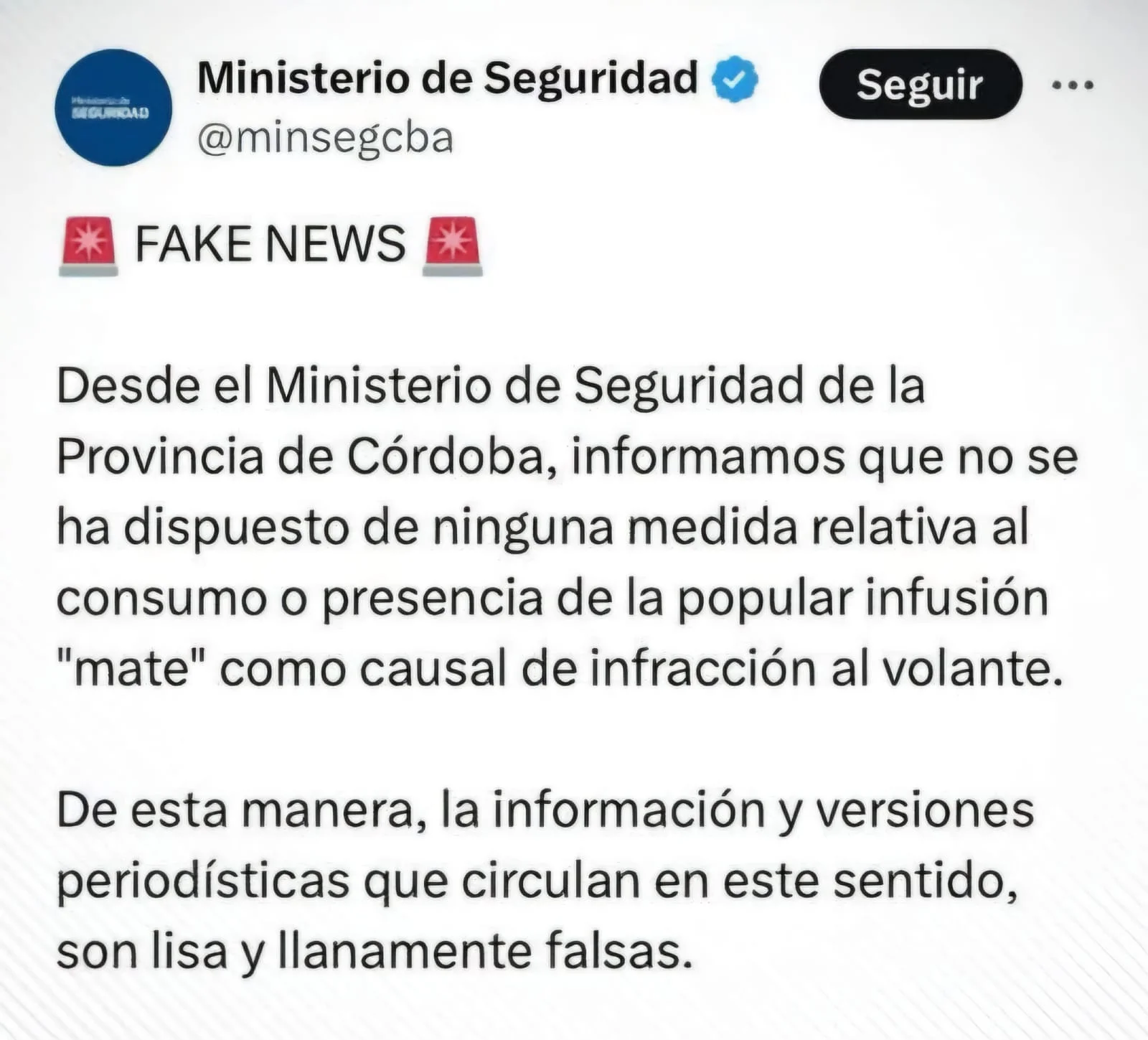 En un comunicado oficial, el Ministerio expresó: «Informamos que no se ha dispuesto de ninguna medida relativa al consumo o presencia de la popular infusión ‘mate’ como causal de infracción al volante». De esta manera, las autoridades provinciales desmintieron categóricamente las versiones que circulaban al respecto.