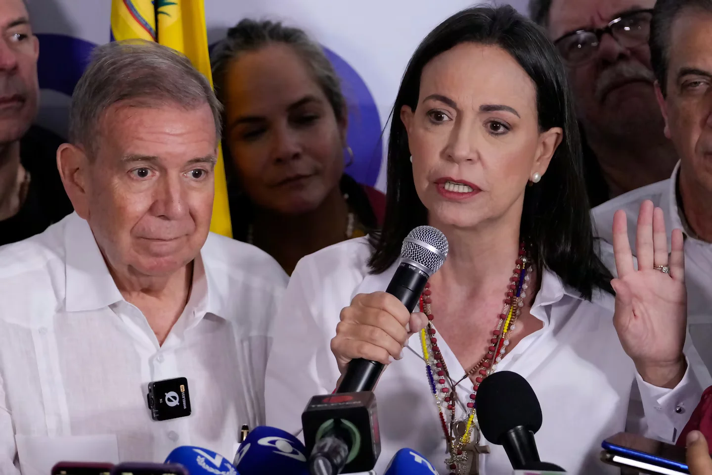 La líder opositora venezolana María Corina Machado, junto con el candidato presidencial Edmundo González Urrutia, dio una conferencia de prensa en Caracas luego de que las autoridades electorales declararan a Nicolás Maduro como ganador de las elecciones presidenciales.